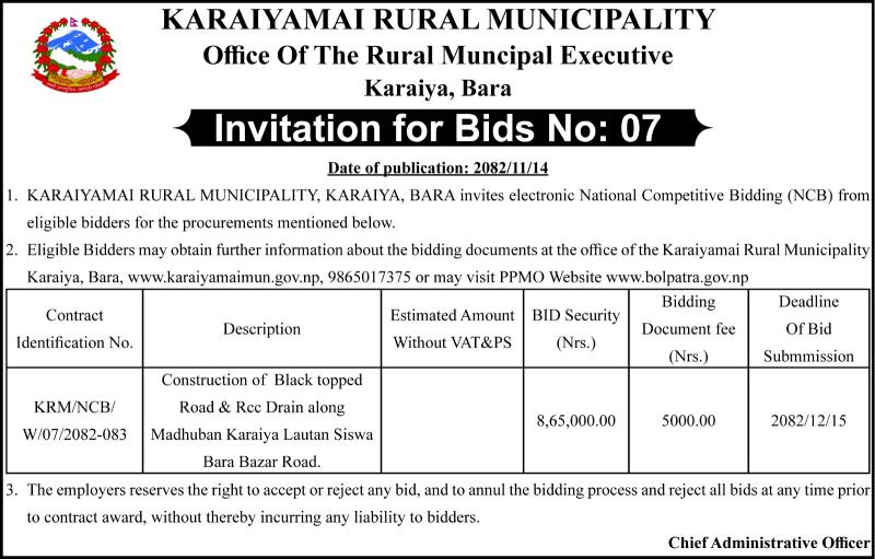 Invitation of Bids No.7 Construction of Black topped Road & RCC Drain along Madhuwan Karaiya lautan Siswa Barabazar Road