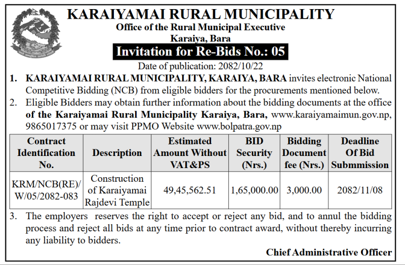 Invitation of Re-Bid - Construction of Karaiyamai Rajdevi Temple