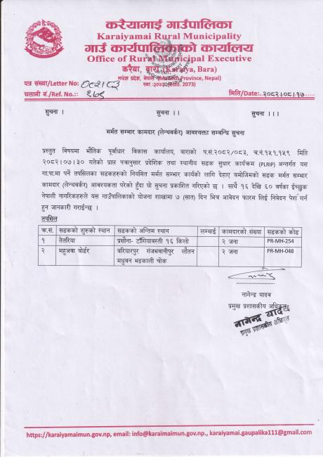 मर्मत सम्भार कामदार आवश्यक्ता सम्बन्धी सूचना